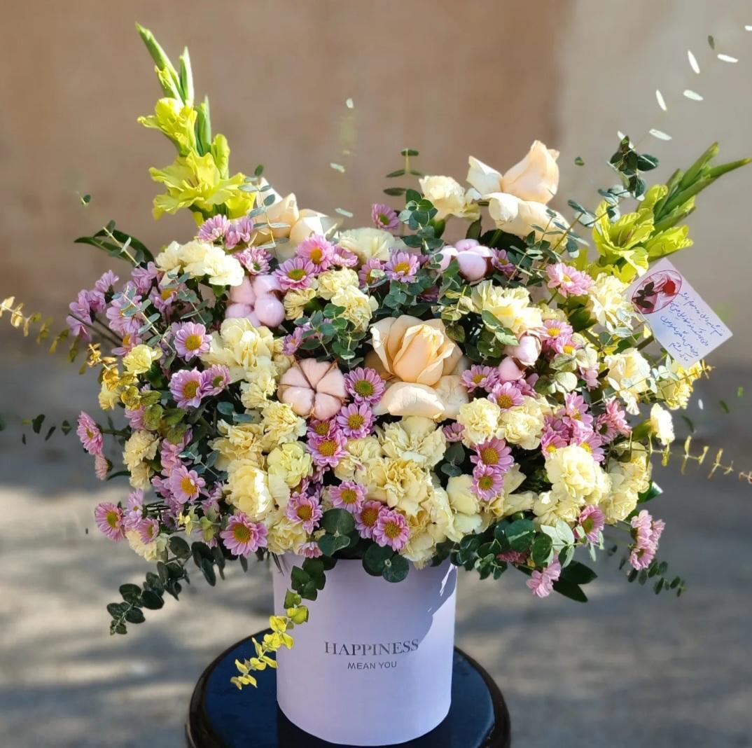 مشخصات محصول: باکس گل آلیس شامل گل رز گلبهی، میخک لیمویی، داوودی یاسی، گلایل لیمویی، گل پنبه و برگ اکالیپتوس می باشد که در باکس استوانه یاسی خوشرنگ تزیین شده است