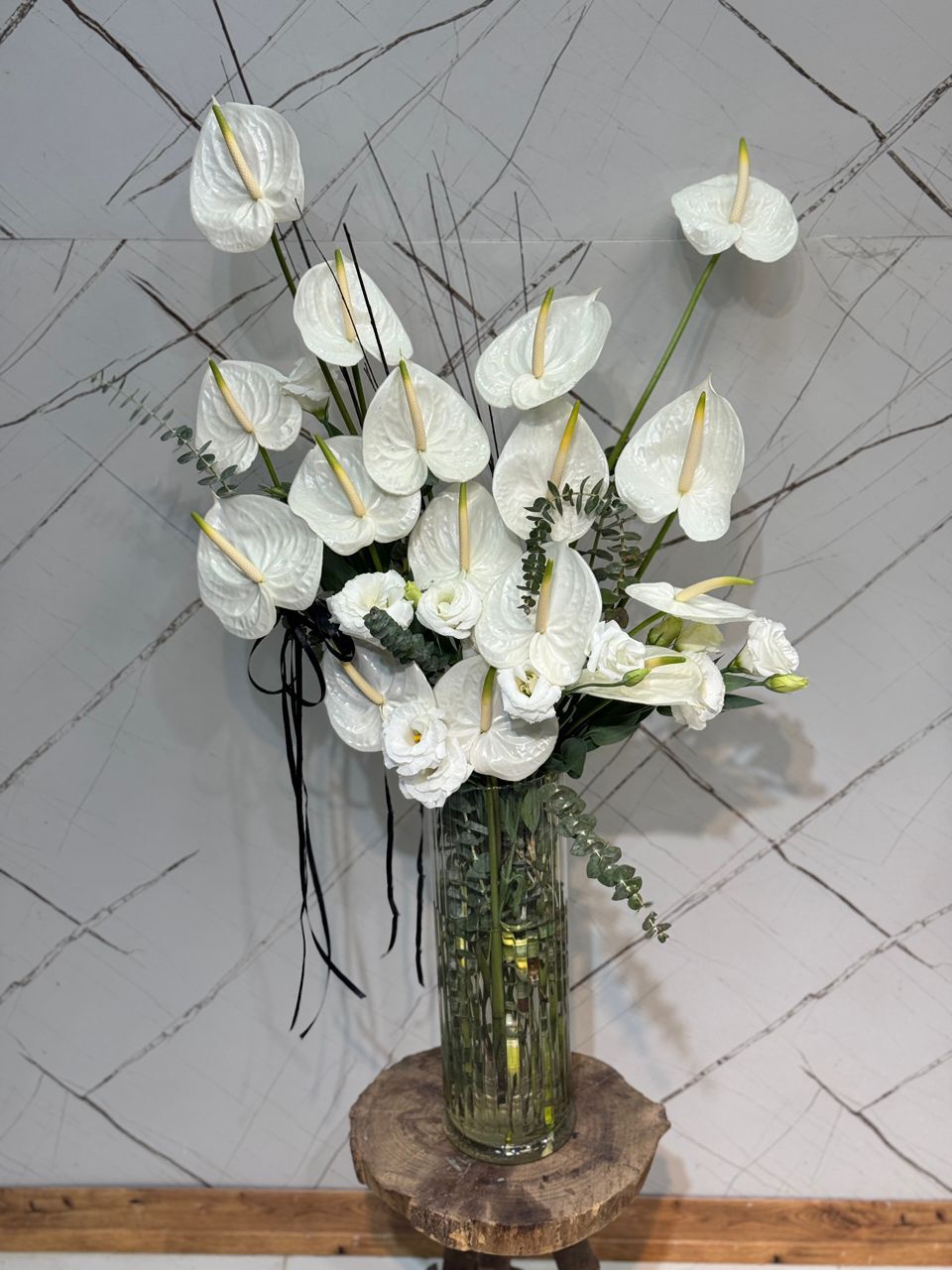 مشخصات محصول: گلدان شیشه ای آیسو شامل گل لیسیانتوس سفید، آنتریوم سفید، گل خشک مشکی و برگ اکالیپتوس می باشد که در گلدان شیشه ای به همراه روبان تزیین شده است