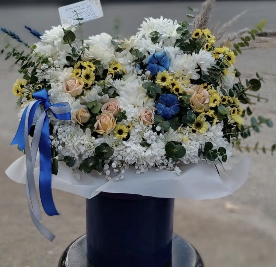 مشخصات محصول: باکس گل برسام شامل رزمینیاتوری گلبهی، میخک لیمویی، داوودی سفید و برگ اکالیپتوس میباشد که با گل خشک سرمه ای، پنبه آبی، کاغذ لیمویی و روبان در گلدان سرمه ای فلزی تزیین شده است.