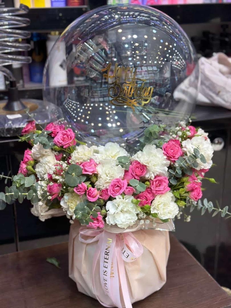 خرید آنلاین گلدان گل و بادکنک گیلدا، با تزیینی شاهانه و زیبا با استفاده از گل های معروفی همچون گل رز مینیاتوری، گل میخک و گل عروس به همراه یک عدد بادکنک، برای مناسبت های مختلف بسیار گزینه ای شایسته است. چیدمان و قرار گرفتن این گل های زیبا در کنار هم، آنچه لازمه یک سورپرایز شیک و جذاب است را فراهم کرده اند. همچنین، ترکیب رنگ های سفید، صورتی و سبز به زیبایی این گلدان اضافه کرده است. علاوه بر گل ها، وجود یک بادکنک خاکستری درون یک بوبو بالن در بالای گل ها آن را تبدیل به یک هدیه متفاوت برای تقدیم به عزیزان تان می کند. اما نکته قابل توجه دیگر، پیچیده شدن گلدان شیشه ای با کاغذ های نقره ای ضد آب به شیوه ای هنرمندانه است که باعت شده گلدان گل گیلدا یک محصول متفاوت و لاکچری در میان دیگر محصولات باشد