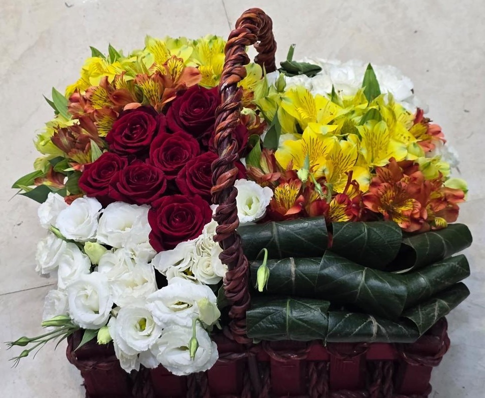 این سبد گل شامل گل های رز، آلسترومریا، داوودی و میخک می باشد