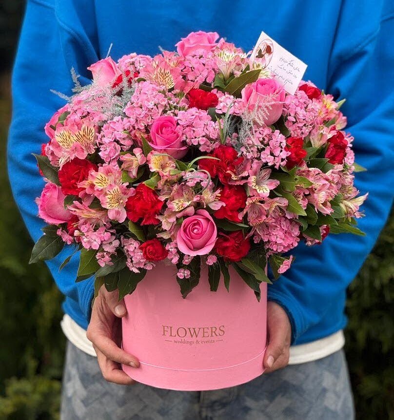 یک باکس شکیل و زیبای صورتی مزین به گلهای رزهلندی صورتی، میخک صورتی و قرمز و گلهای آلستر صورتی