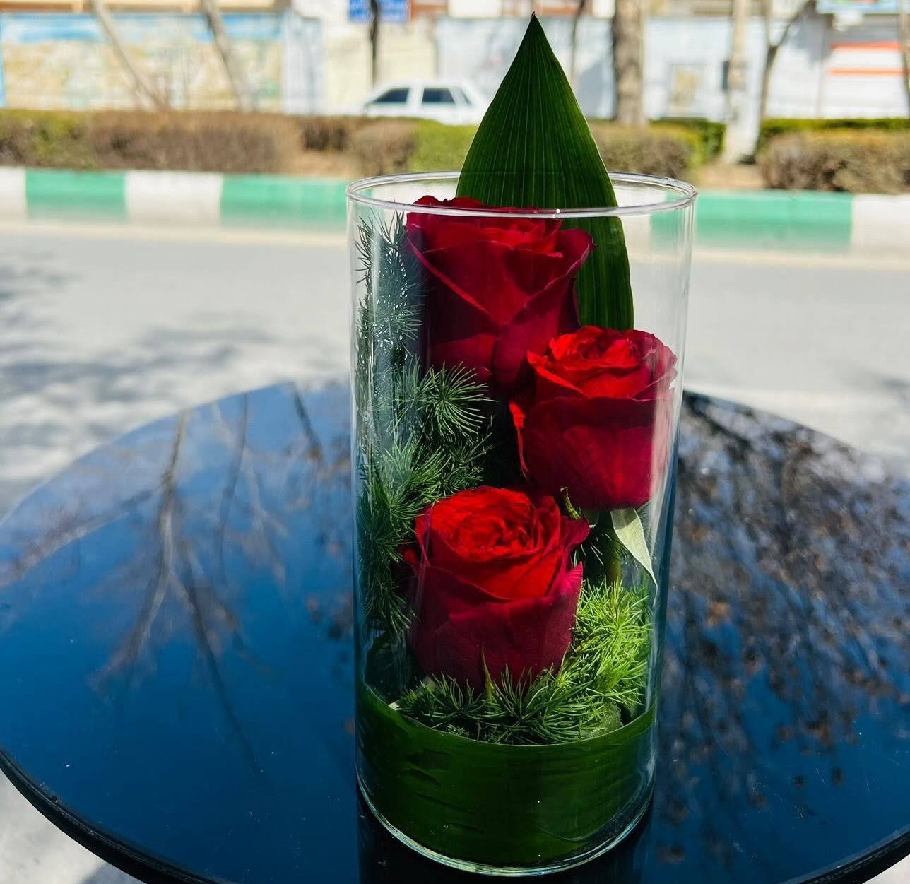 این تنگ بلوری همراه با سه گل رز قرمز تازه به عزیز شما فرستاده میشود